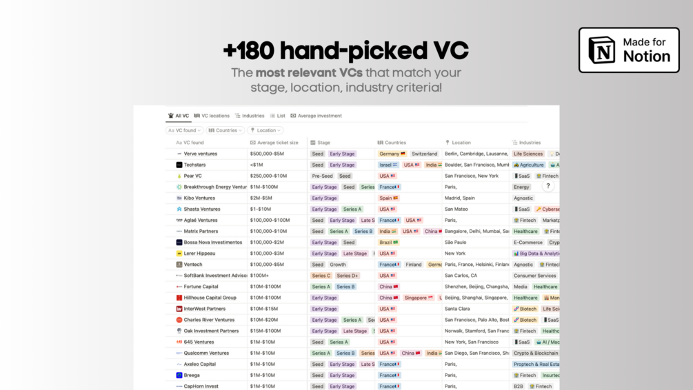 - ๐ +180 Top Curated VC List: Gain instant access to a select list of leading VCs, your quest to find the perfect VC fit begins here!